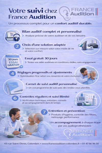 Choisir FRANCE AUDITION, c’est bénéficier d’un accompagnement sérieux, humain et personnalisé. Nos audioprothésistes prennent le temps d’évaluer précisément vos besoins afin de vous proposer des solutions auditives adaptées à votre mode de vie et à votre budget.